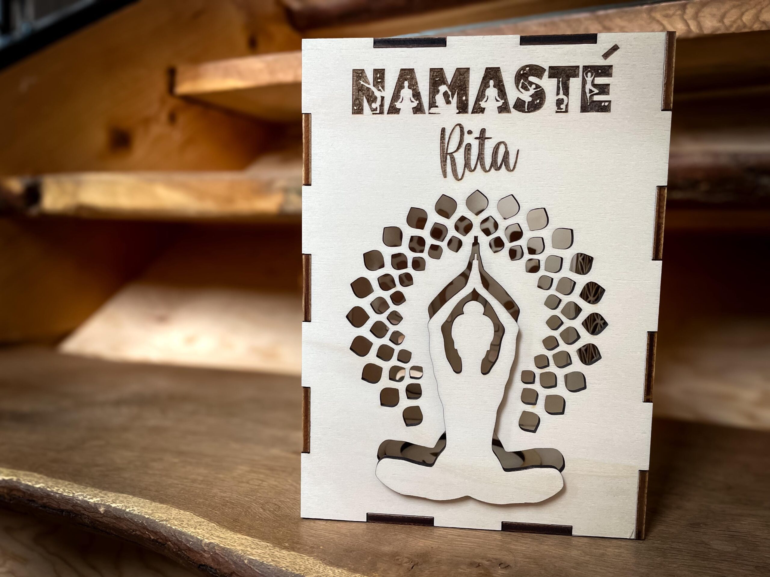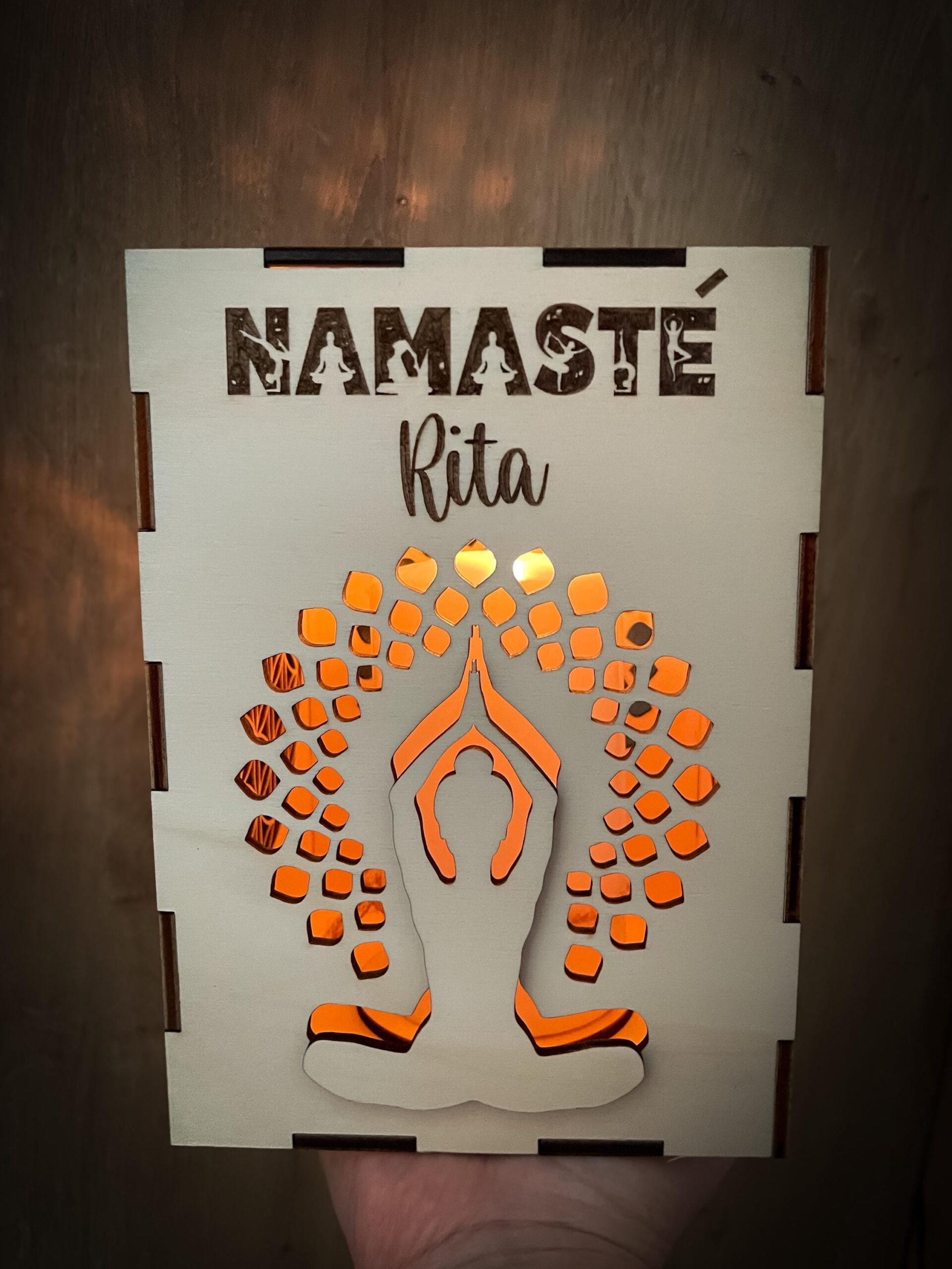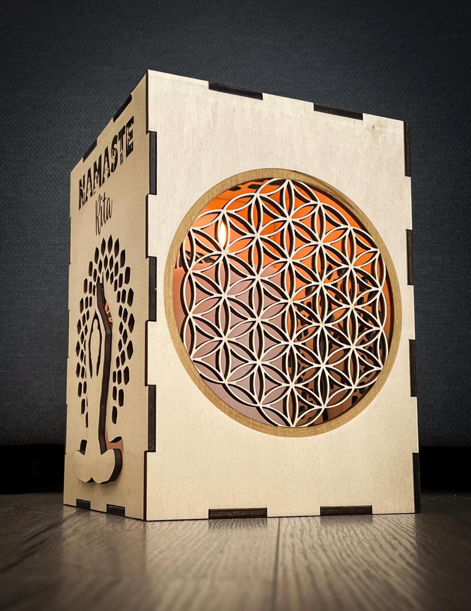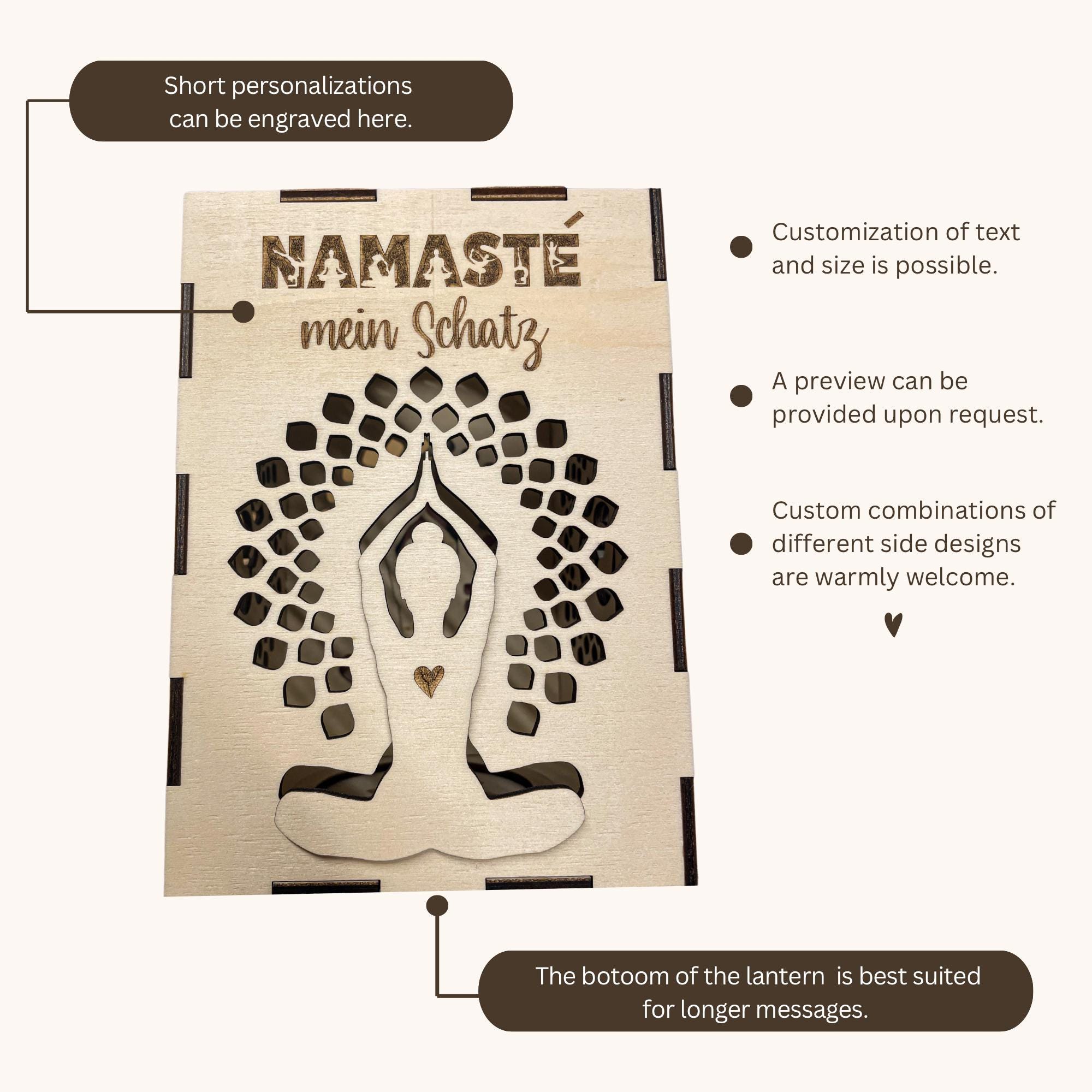 Diese hölzerne Schattenlaterne mit der schönen spirituellen Silhouette einer Dame, die ihre Hände in Namasté (Dank oder Beute) hält, könnte zu einem tollen Geschenk für Deine (spirituellen) Freunde, Familienmitglieder, Verwandten und geliebten Menschen umgewandelt werden. Mit unserem exklusiven Gravurservice wird Dein Geschenk noch persönlicher, berührender, einzigartiger und sentimentaler. Auf dem untenen Teil des Bodens lassen sich individuelle Botschaften, persönliche Wünsche und spirituelle Sprüche gern eingravieren.