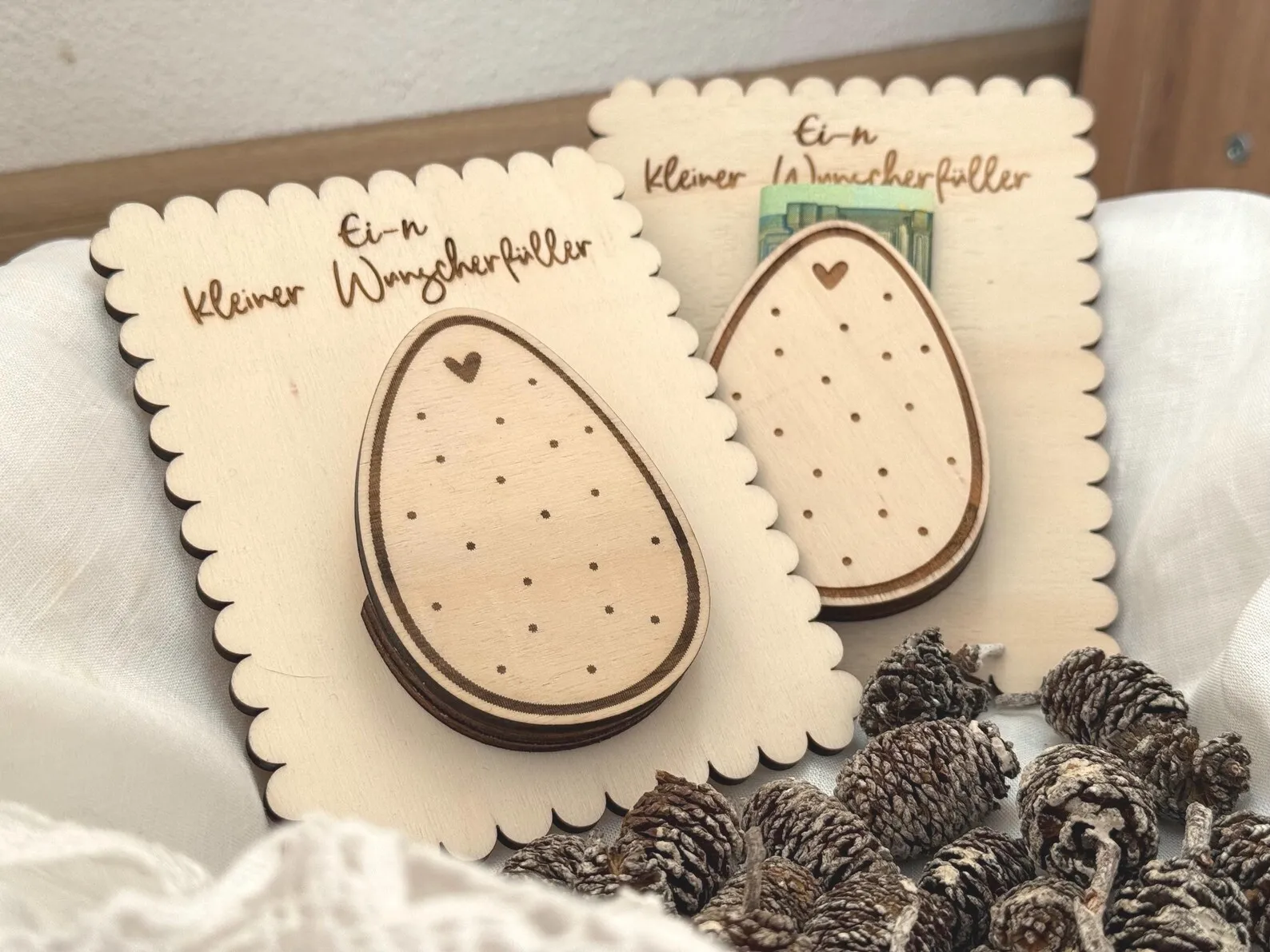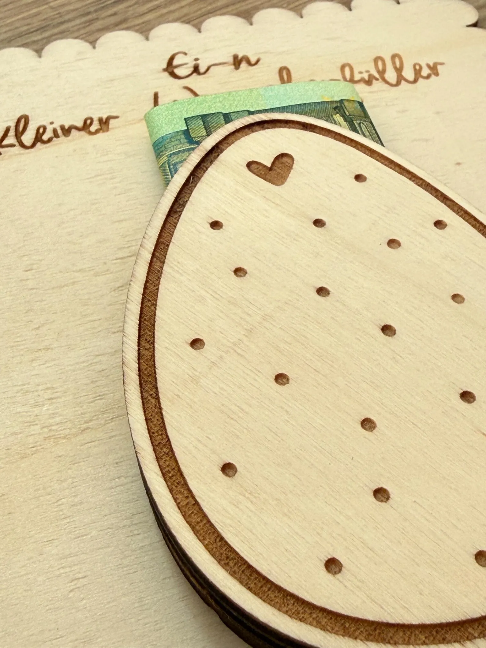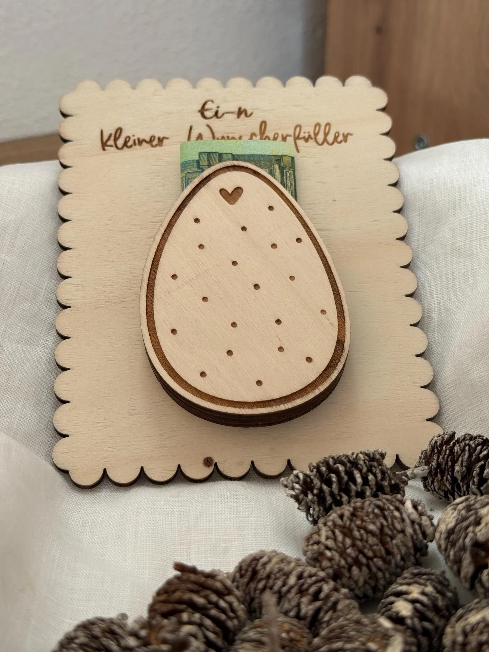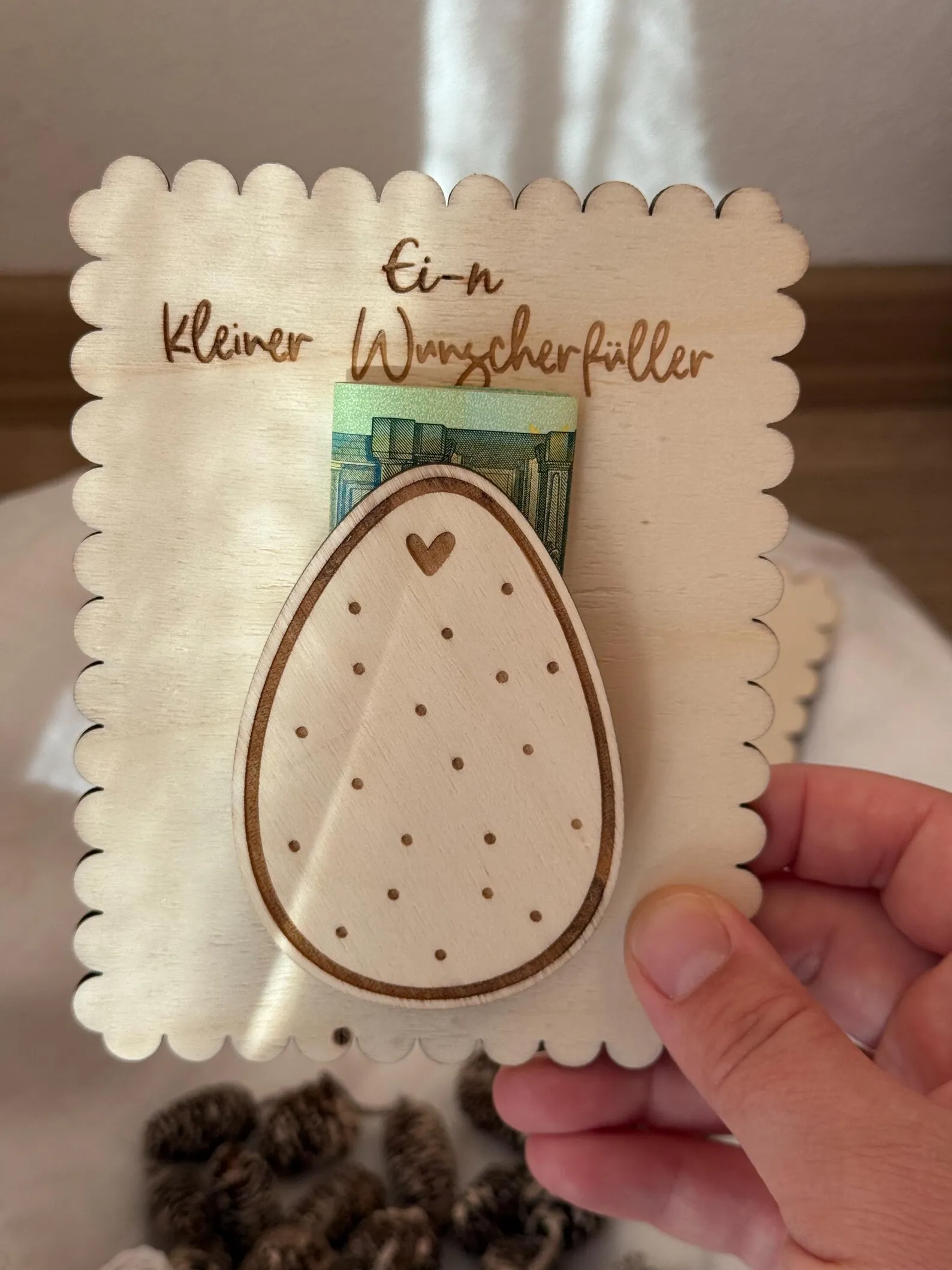 Der Geldschein wird einfach zusammengerollt und in die Aussparung des Holz-Eis gesteckt – so entsteht im Handumdrehen ein persönliches Ostergeschenk, das perfekt ins Osternest passt.