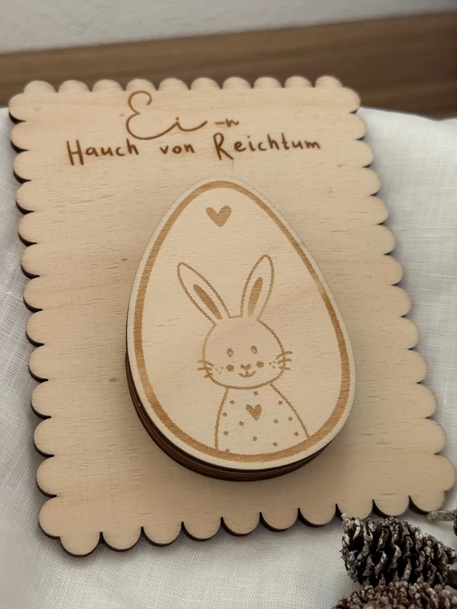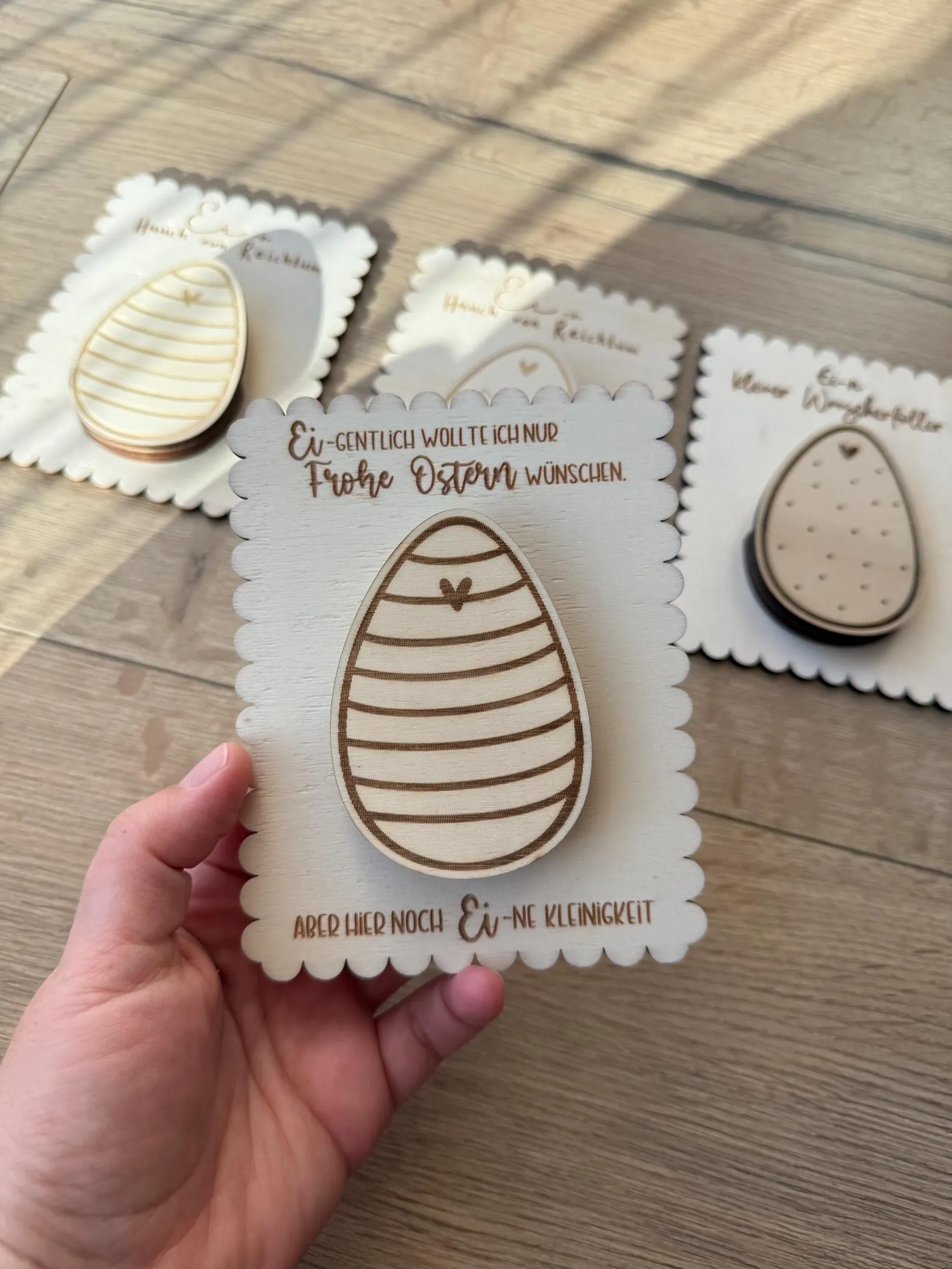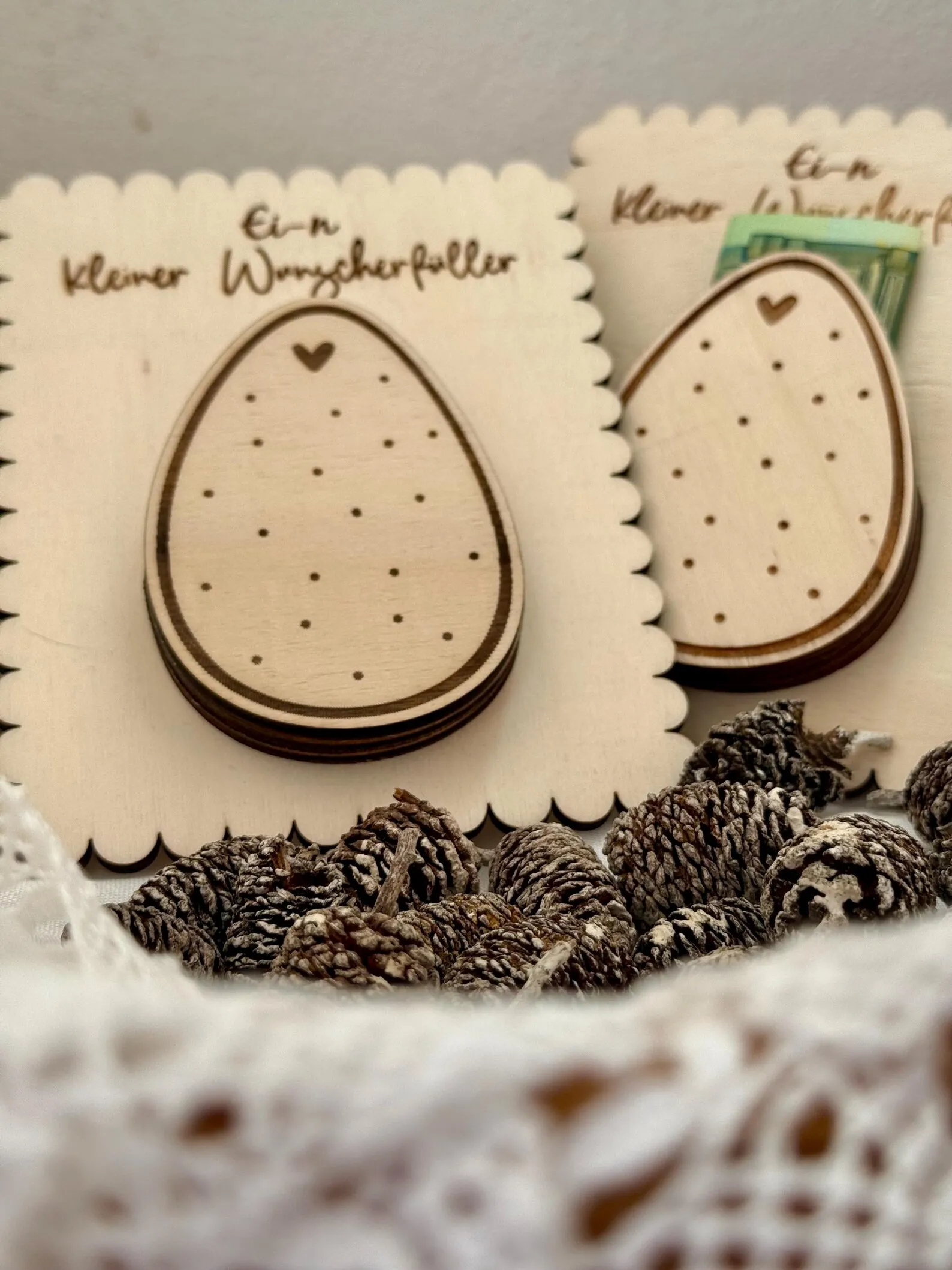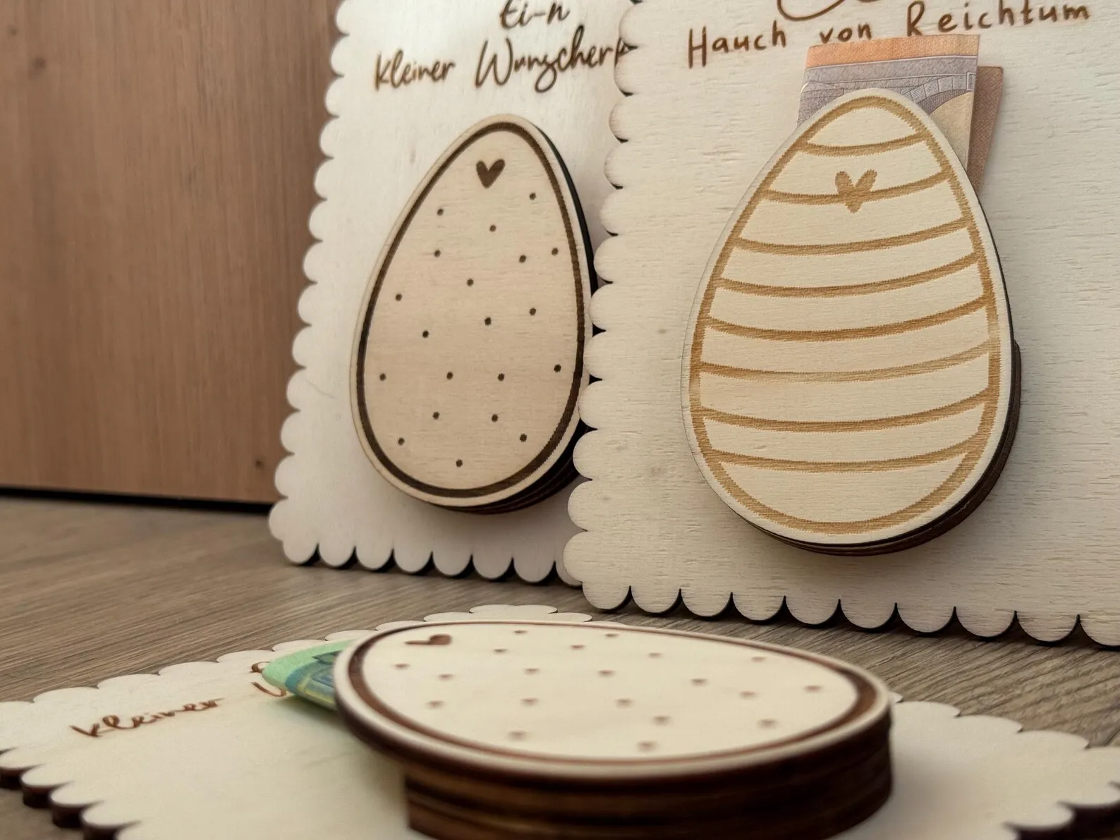 Der Geldschein wird einfach zusammengerollt und in die Aussparung des Holz-Eis gesteckt – so entsteht im Handumdrehen ein persönliches Ostergeschenk, das perfekt ins Osternest passt.