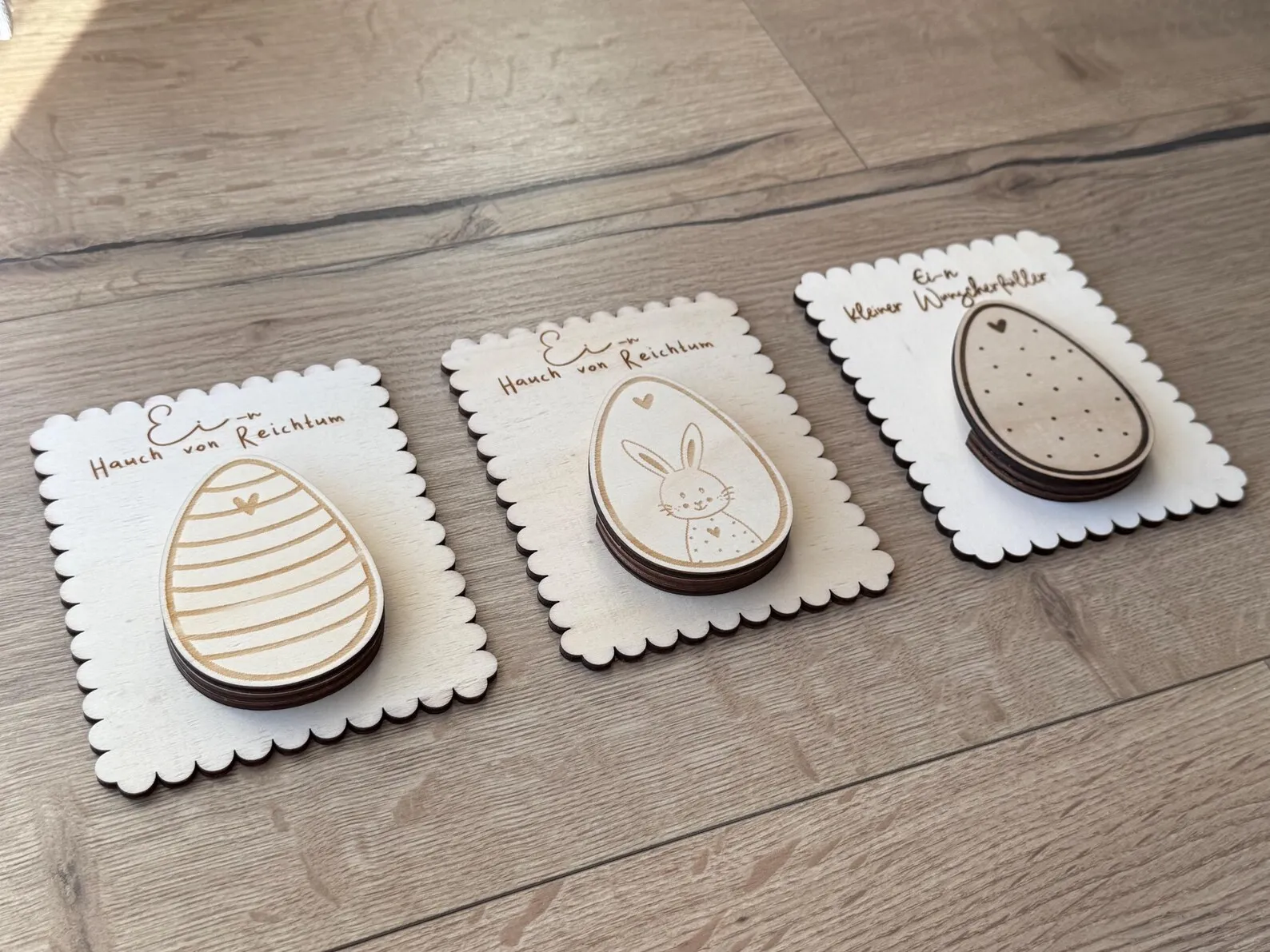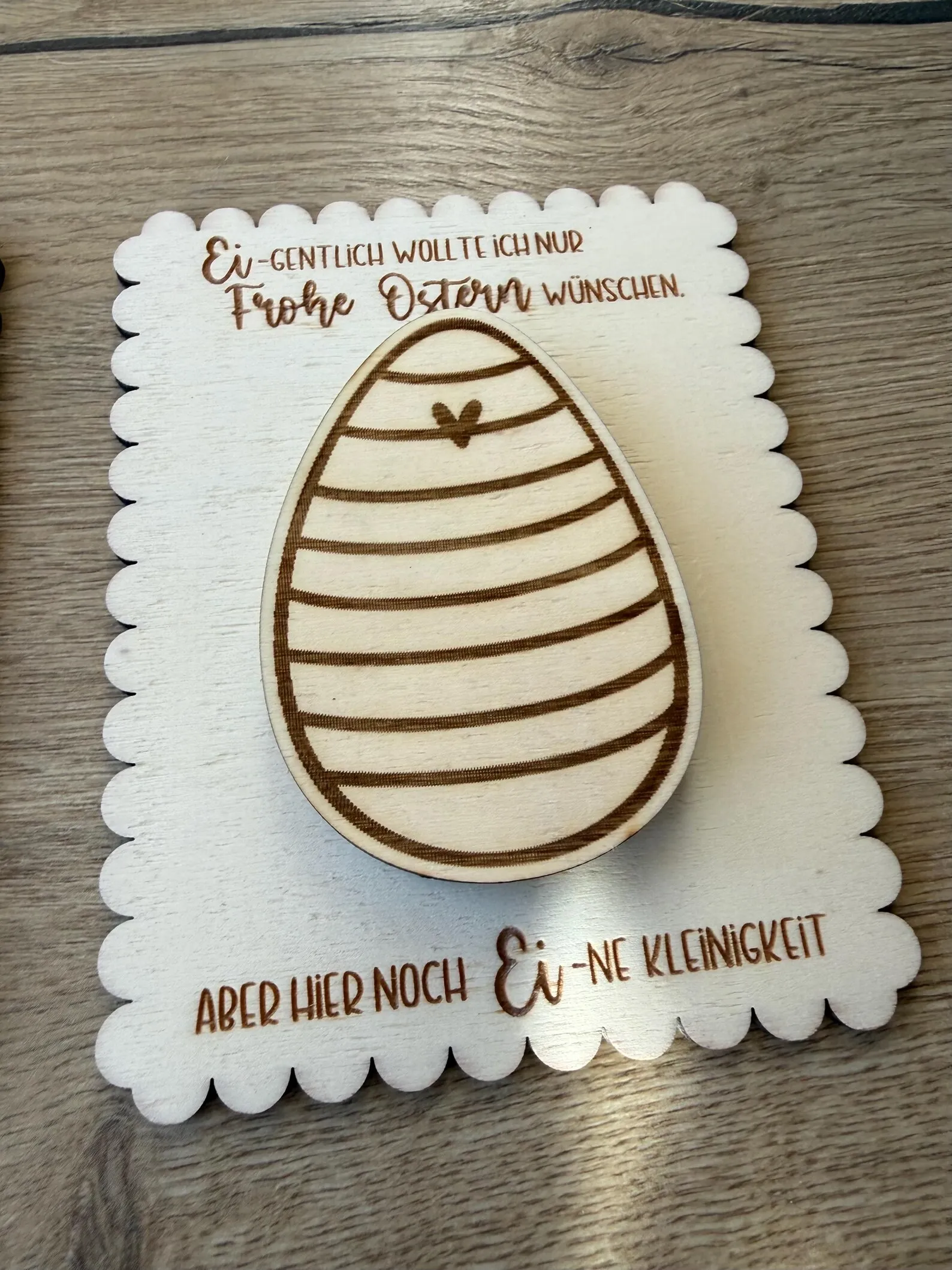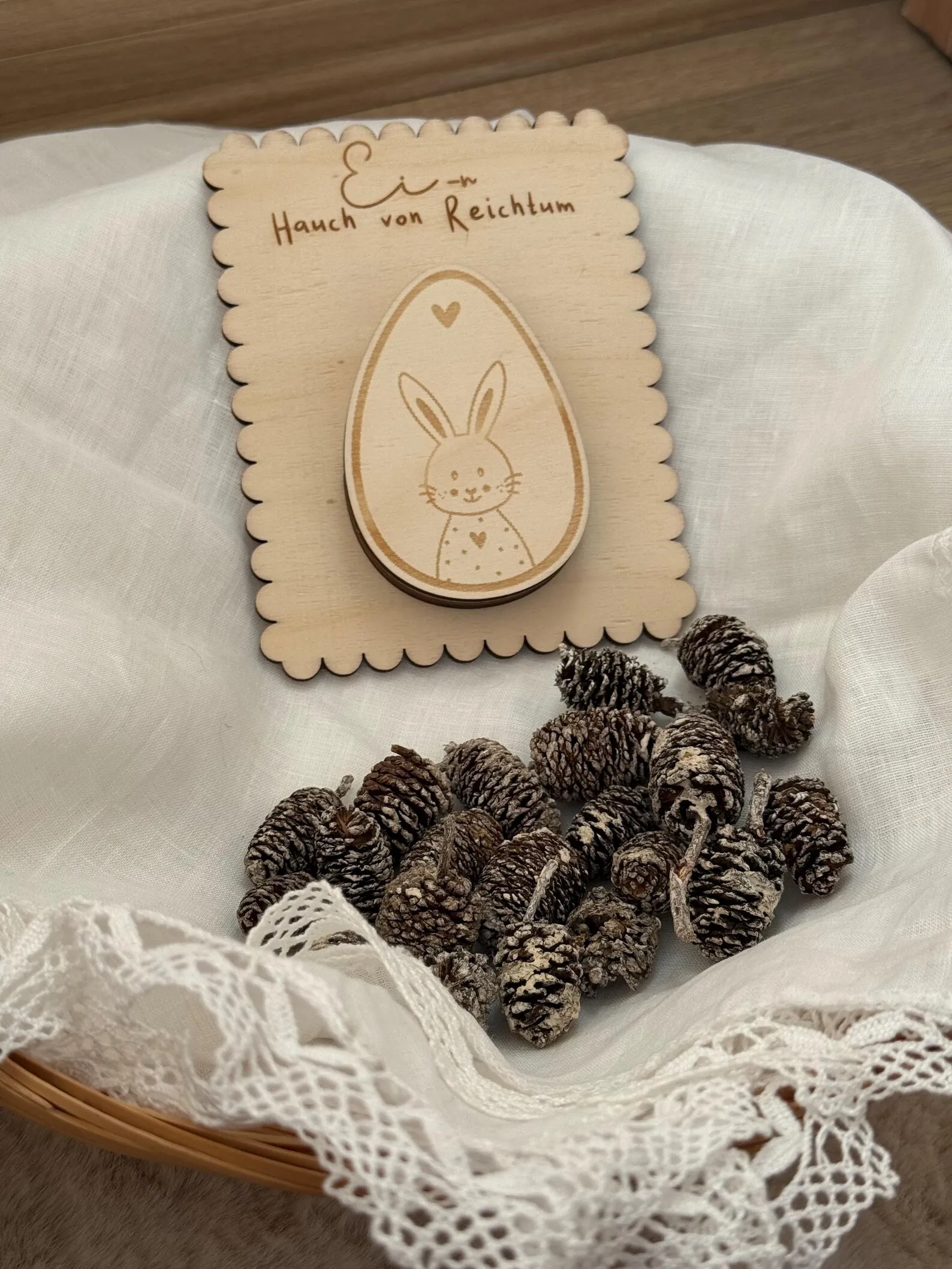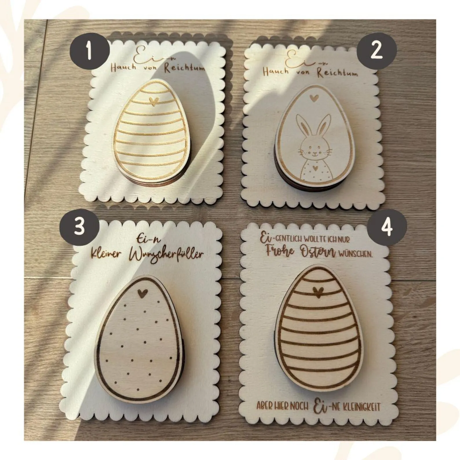 Der Geldschein wird einfach zusammengerollt und in die Aussparung des Holz-Eis gesteckt – so entsteht im Handumdrehen ein persönliches Ostergeschenk, das perfekt ins Osternest passt.