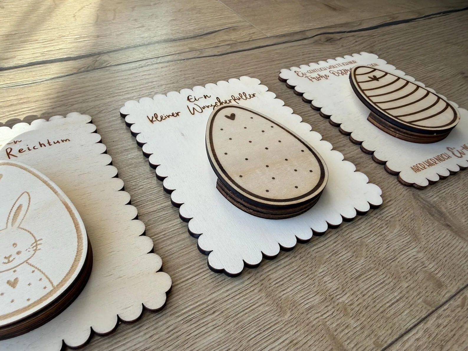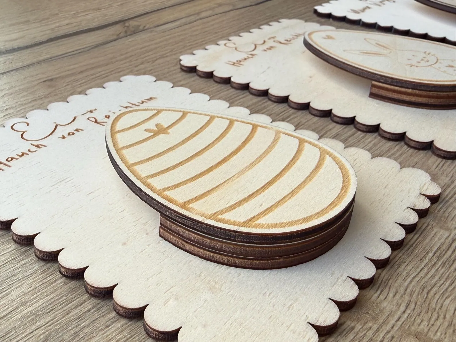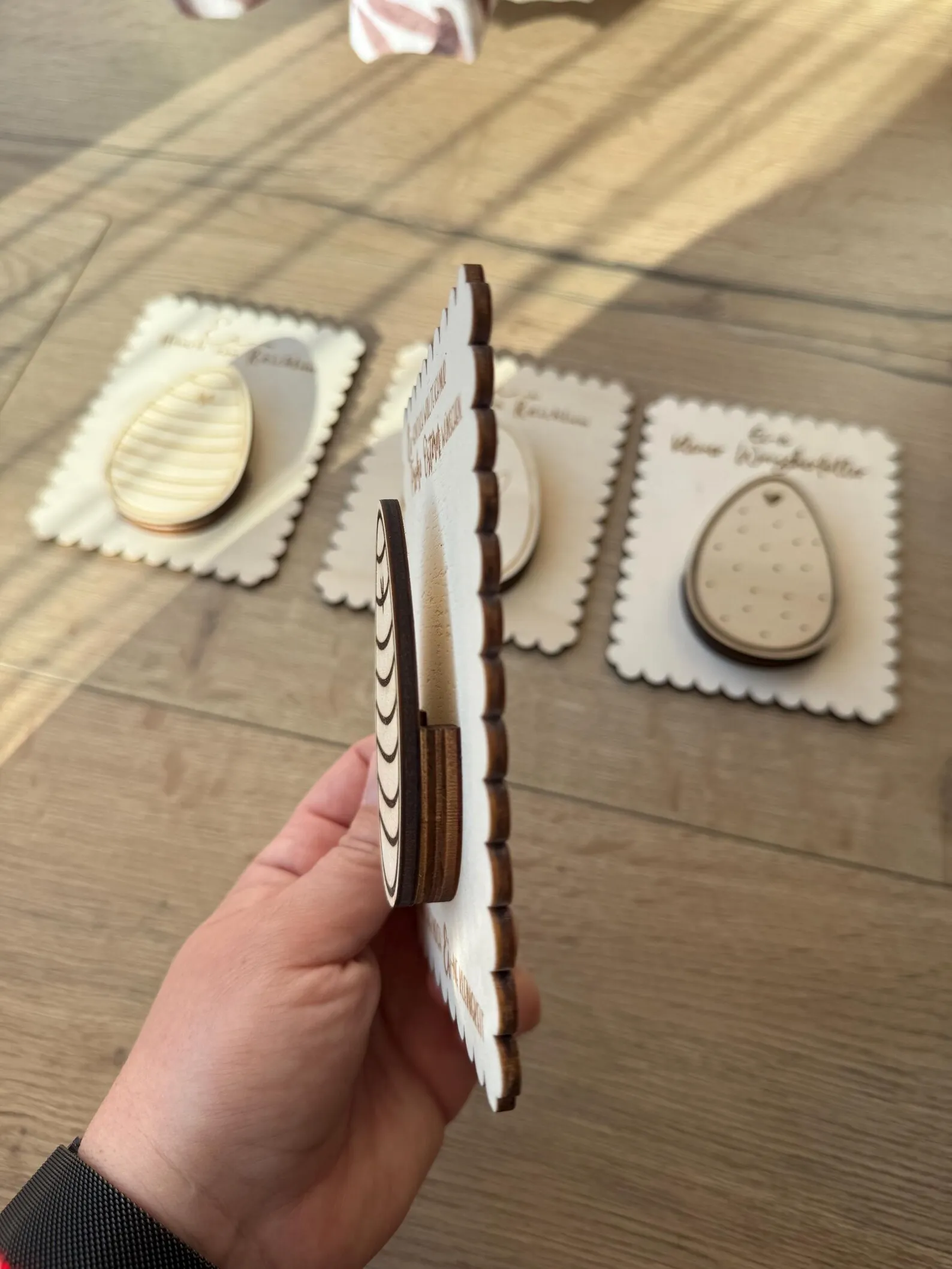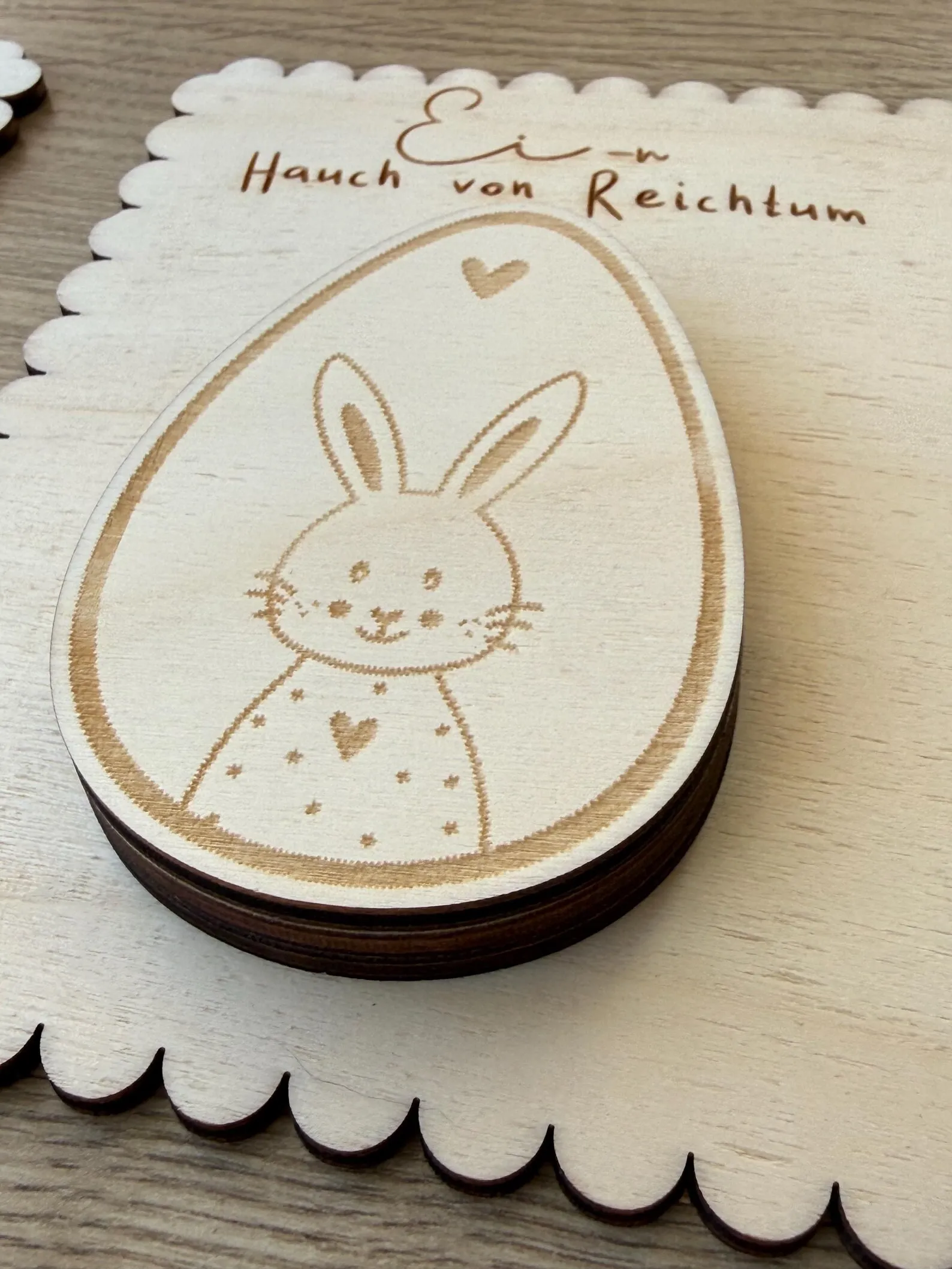 Der Geldschein wird einfach zusammengerollt und in die Aussparung des Holz-Eis gesteckt – so entsteht im Handumdrehen ein persönliches Ostergeschenk, das perfekt ins Osternest passt.