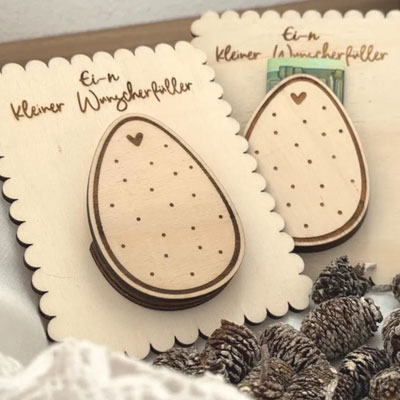 Die Kombination aus natürlichem Holz, feiner Gravur und schlichtem Design macht den Wunscherfüller zu einer stilvollen Alternative zum klassischen Geldkuvert.