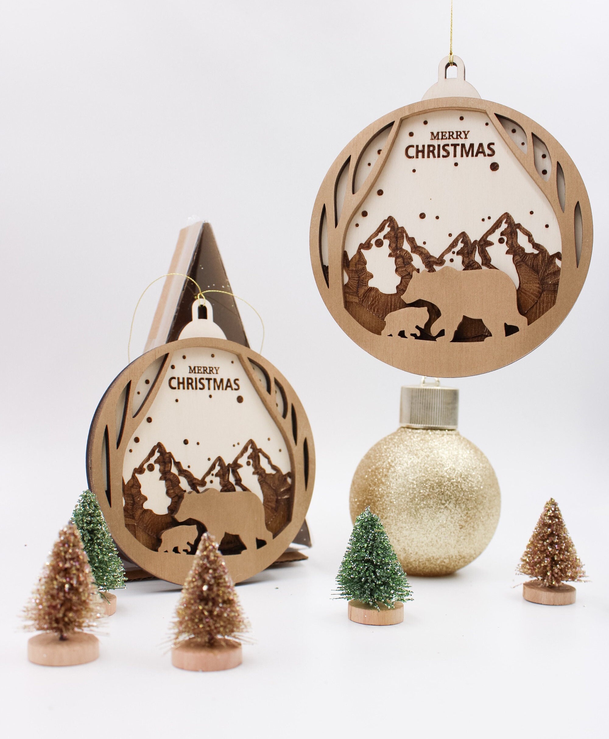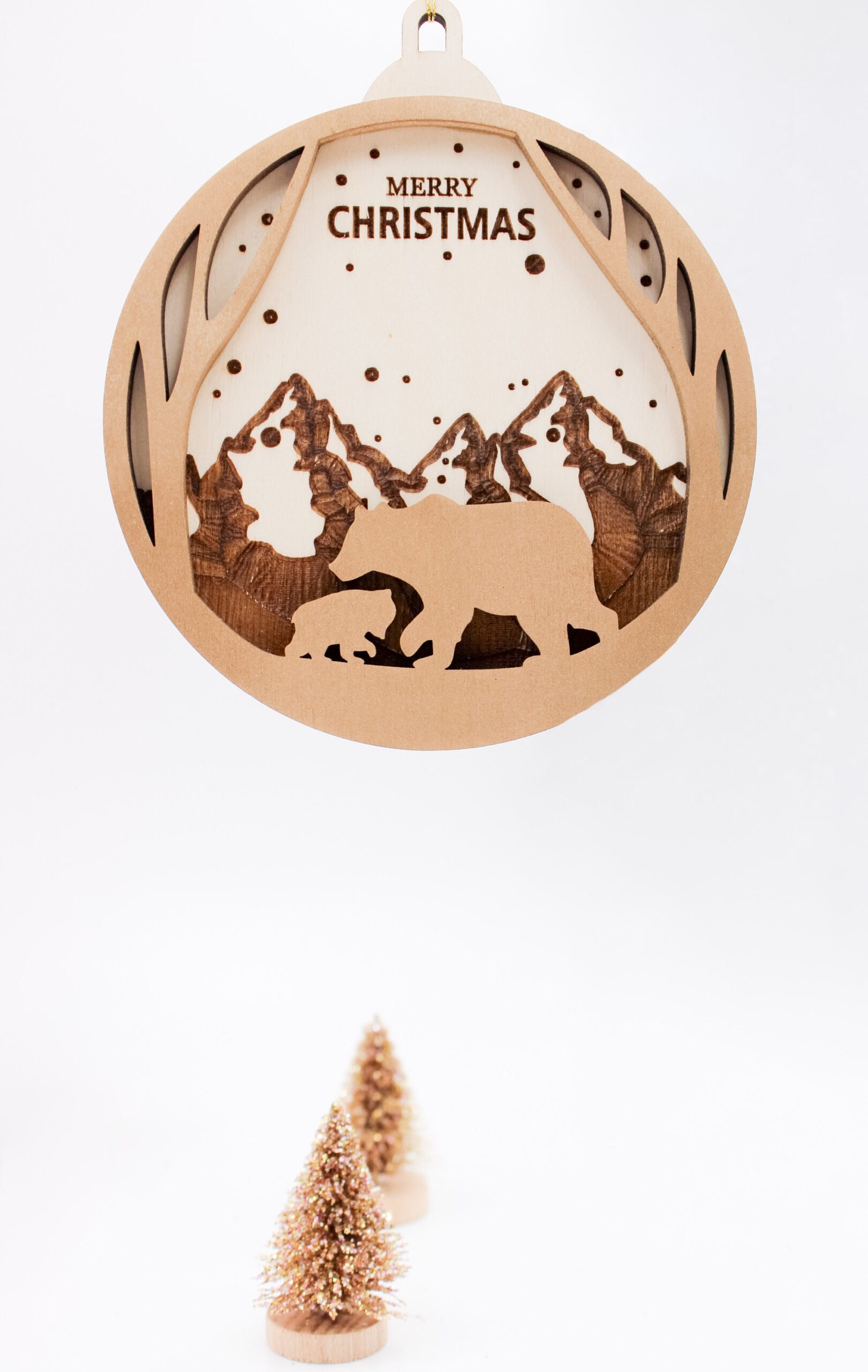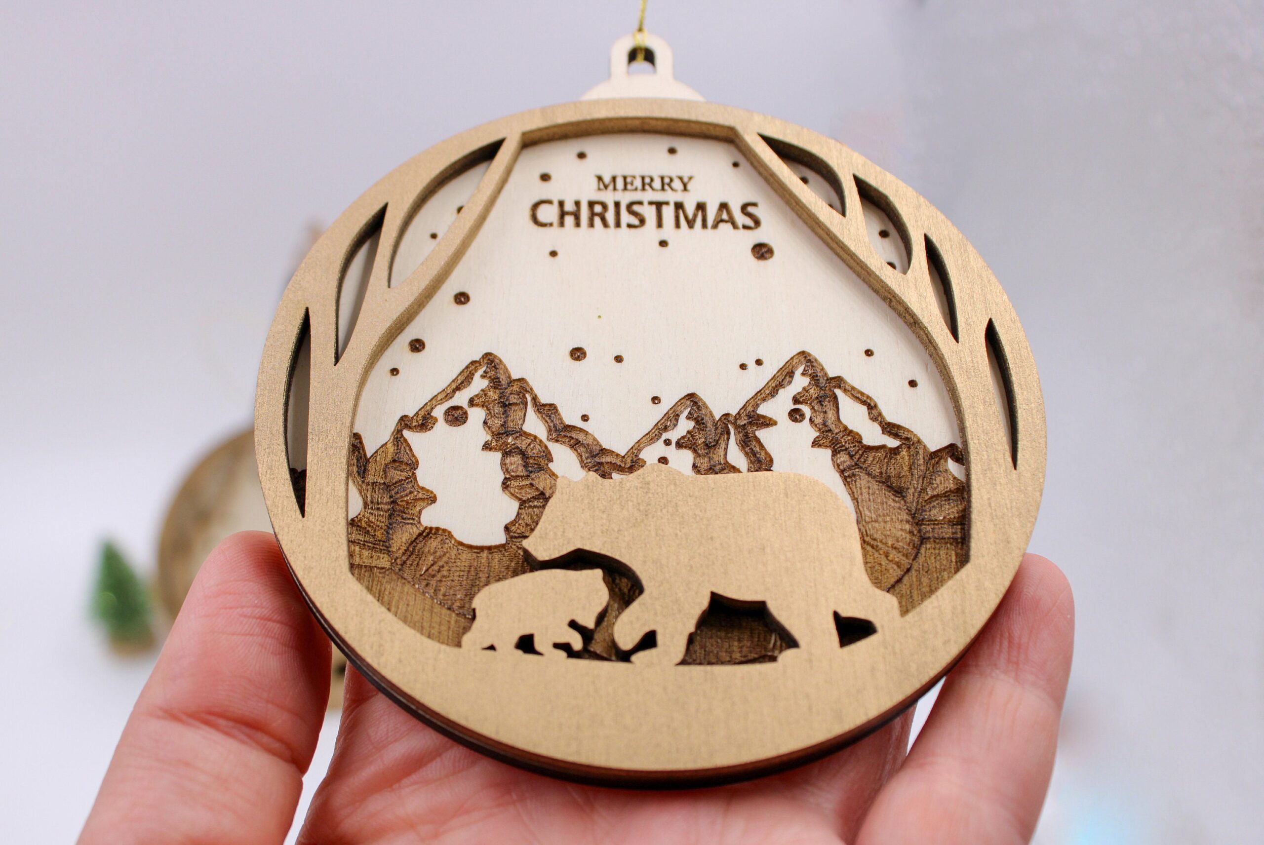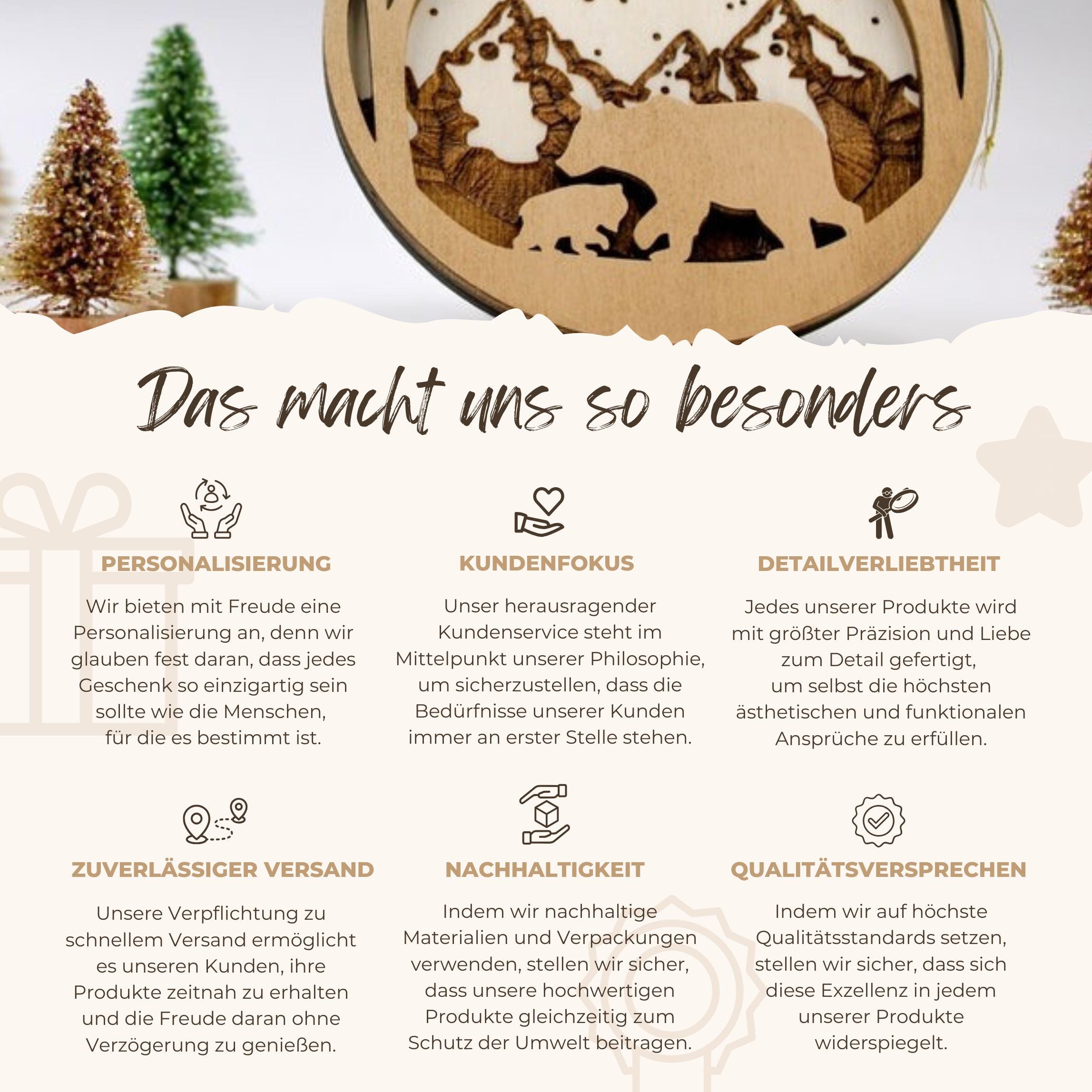 Jedes Ornament wird aus leichtem, robustem Holz gefertigt und kunstvoll graviert. Das bezaubernde Design vom Christbaumkugel zeigt zwei Bären vor einem majestätischen Gebirge, was dem Schmuckstück einen Hauch von Naturverbundenheit und festlicher Eleganz verleiht. Es passt perfekt zu Deiner weihnachtlichen Dekoration und sorgt für eine harmonische Atmosphäre.