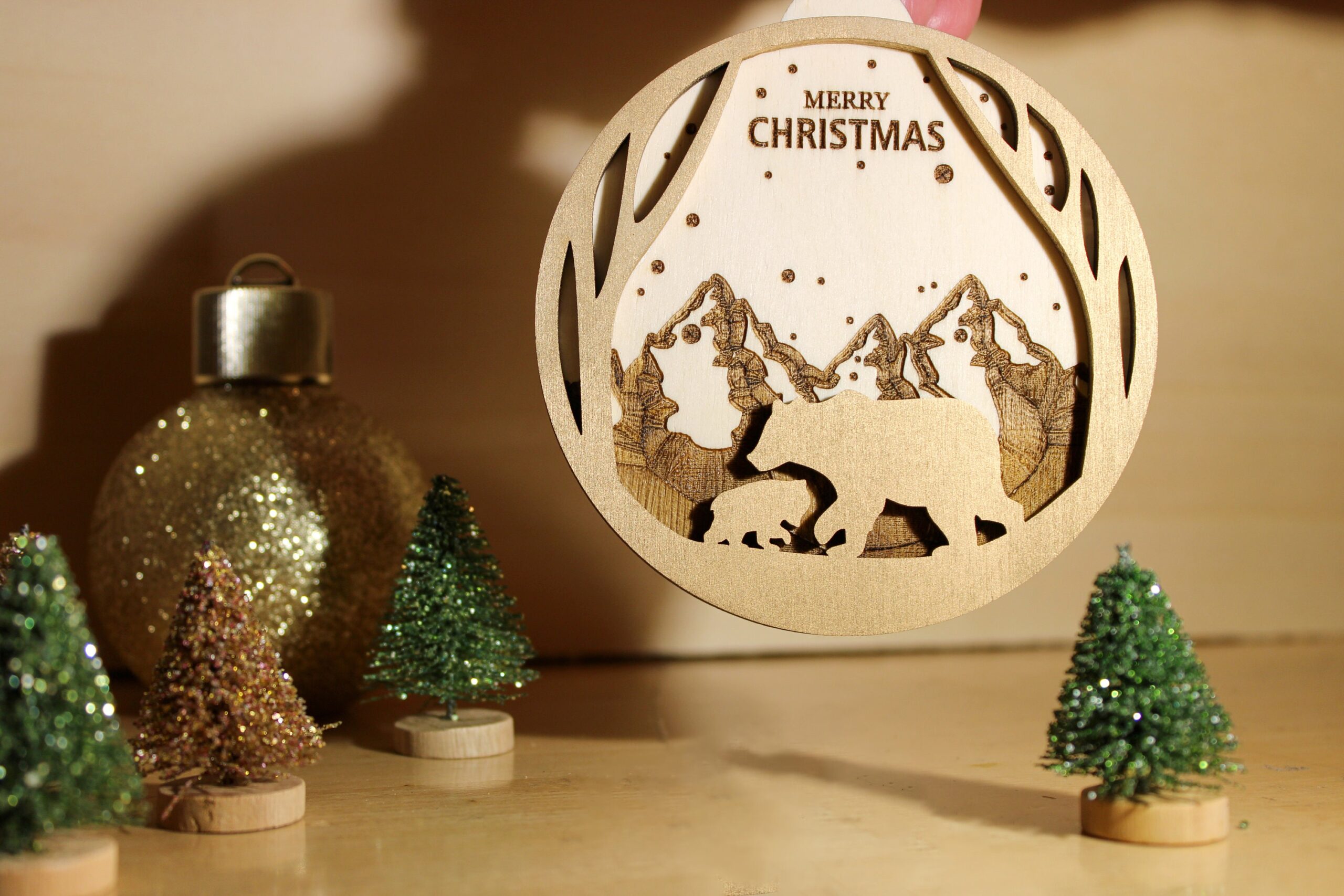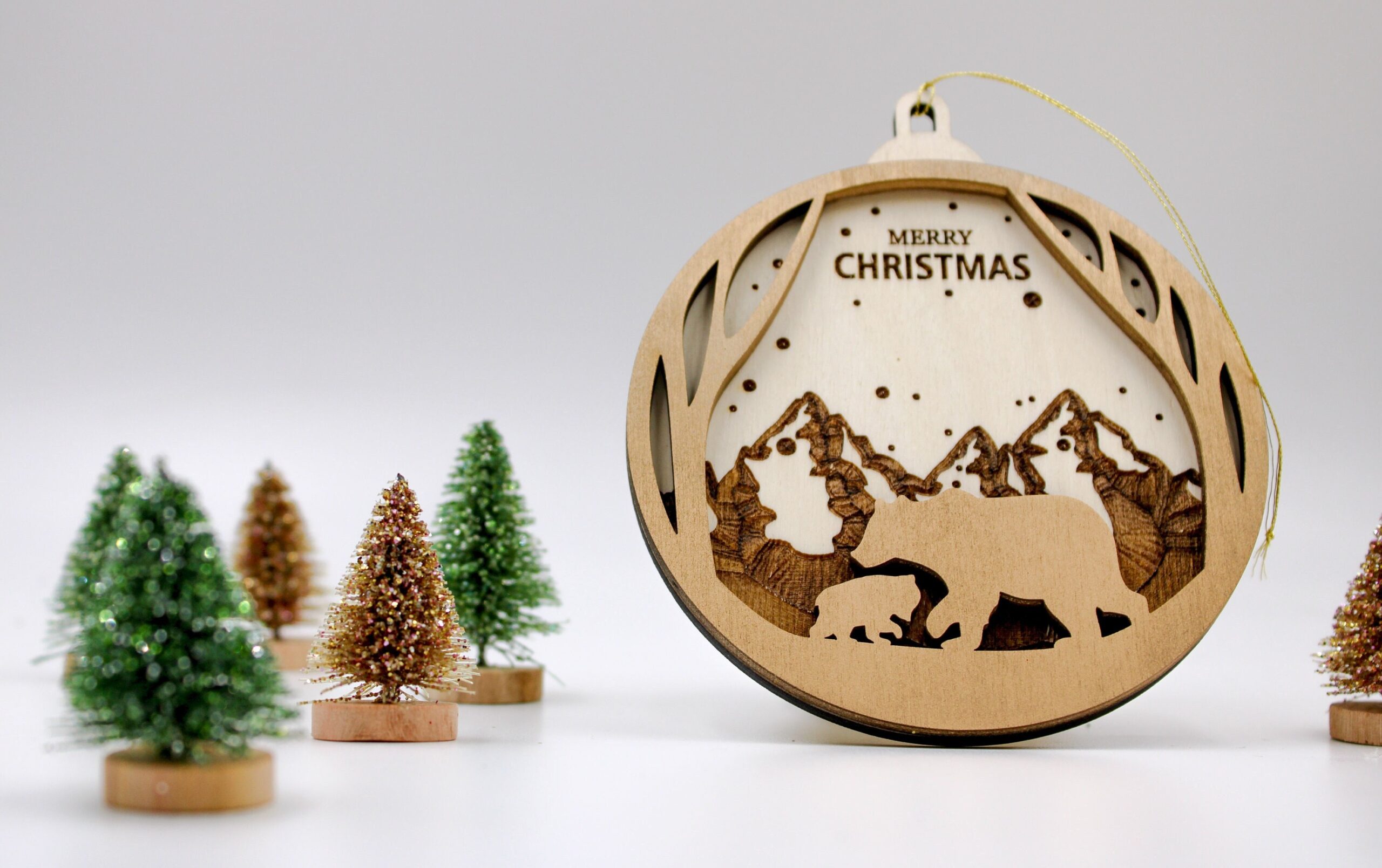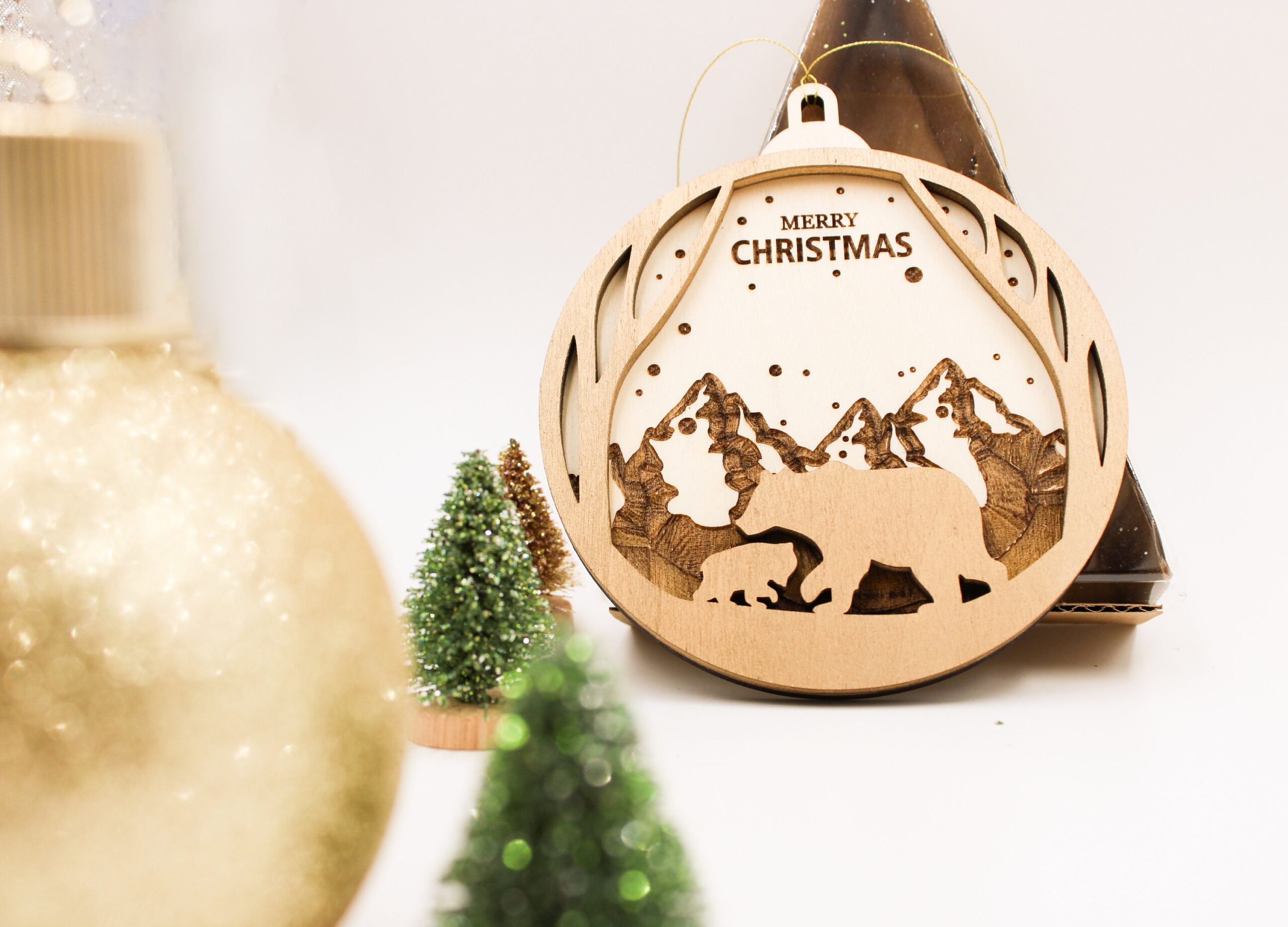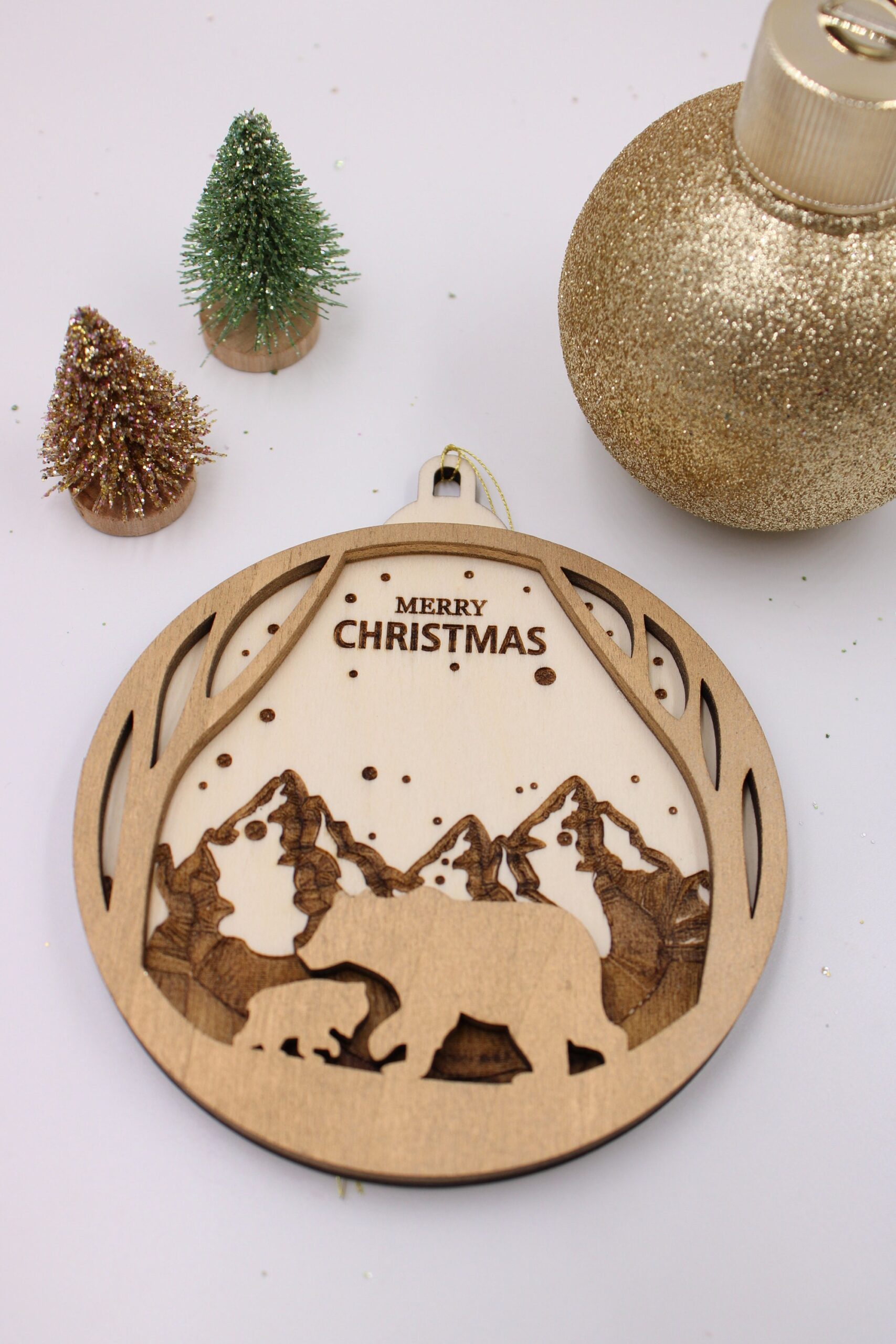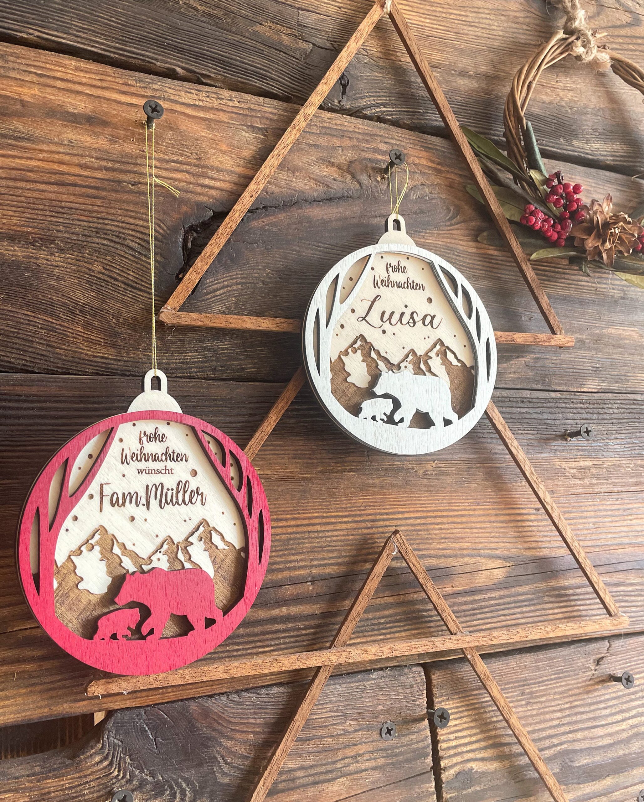 Jedes Ornament wird aus leichtem, robustem Holz gefertigt und kunstvoll graviert. Das bezaubernde Design vom Christbaumkugel zeigt zwei Bären vor einem majestätischen Gebirge, was dem Schmuckstück einen Hauch von Naturverbundenheit und festlicher Eleganz verleiht. Es passt perfekt zu Deiner weihnachtlichen Dekoration und sorgt für eine harmonische Atmosphäre.